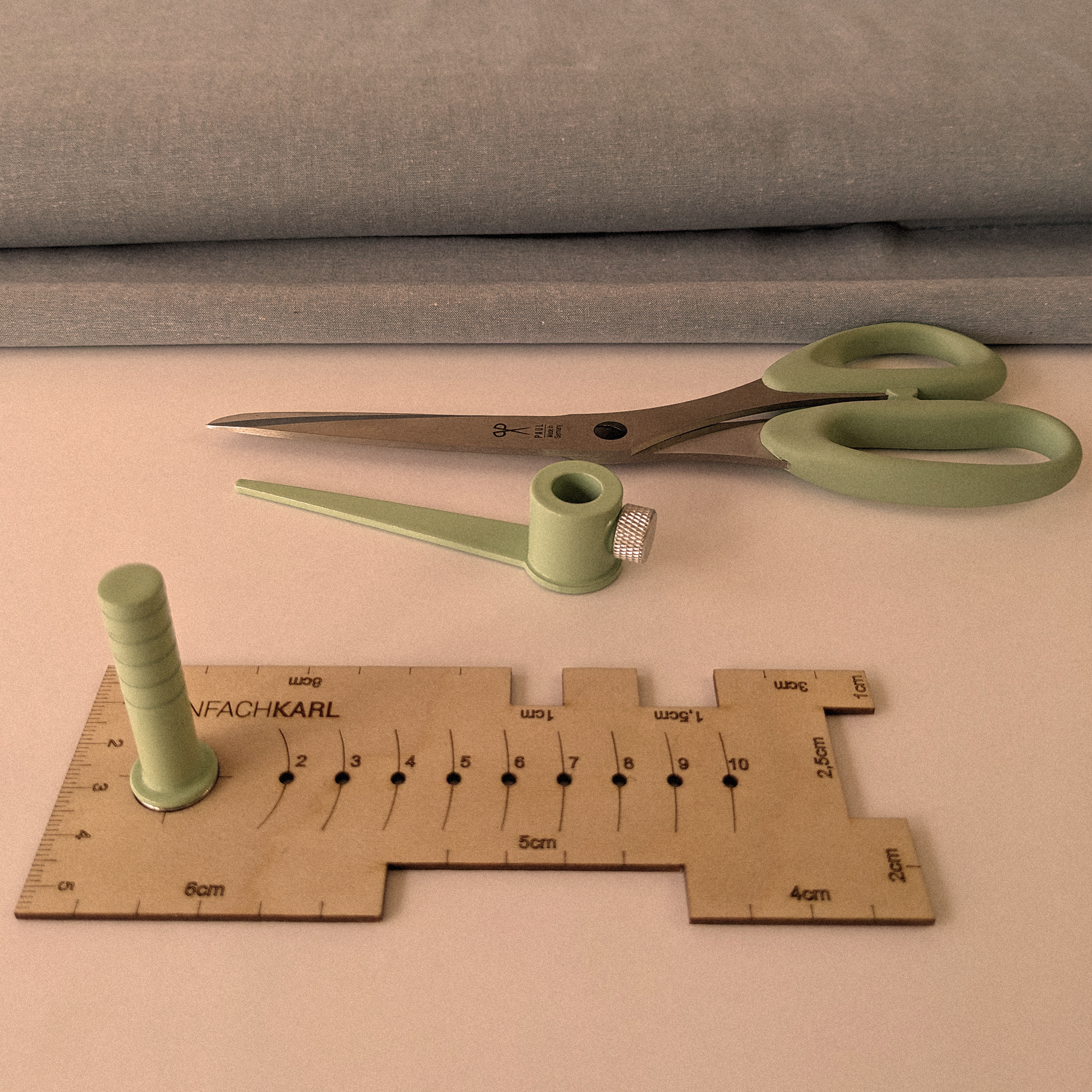 Unsere magnetischen Zuschneidehilfen unterstützen dich beim Zuschnitt deiner Schnittmuster, denn dank ihnen musst du nie wieder Nahtzugaben per Hand anzeichnen. Befestige Karl oder Karlchen einfach magnetisch an deine Schere oder deinen Rollschneider, stelle deinen gewünschten Abstand individuell ein und schneide deine Stoffe zu.